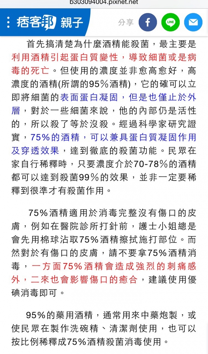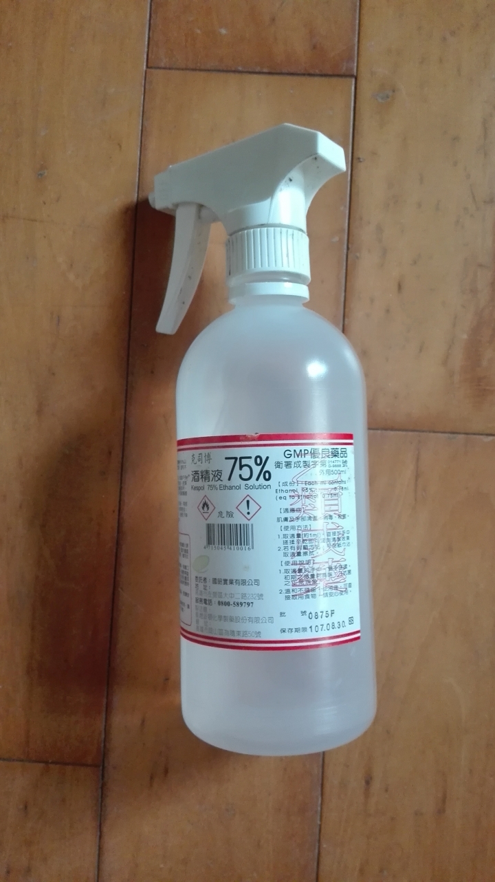 蒸蒸日上,日上蒸蒸 wrote:加水 1/4 即可 大概水1,酒精3的比例混合即可,謝謝。貓八爺 wrote:藥房有賣已經調好的75%酒精溶液,買那種就可以了,價格不貴,買個澆花噴頭裝上去。 因為家裡還有半瓶95%酒精,所以就先自行稀釋來用,之前老爸住護理之家,也有自行裝了一小瓶消毒酒精噴劑自用,不知道是否也是75%酒精?