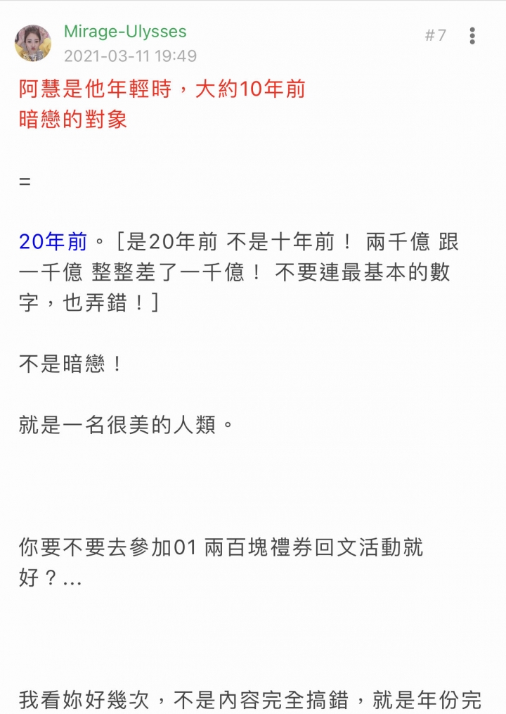 M大真是笑死人了,自己打自己的臉1、原來阿慧是被他跟蹤「20年」,不是我印象中的「10年」,變態行為20年,真替你媽難過,竟然生的兒子如此病態⋯⋯2、他說他從別人引言才看到我說的話,結果竟然能把我的話原封不動複製貼上到他的回文中,太神奇了!原來還是登出大法3、他說我跟他對話若他永遠只會回我200元禮卷的事,這樣打字有意思嗎?你在打你自己的臉耶!你要不要先回答這樓大家的問題?你永遠只回答錢錢錢,你這樣打字有意思嗎?