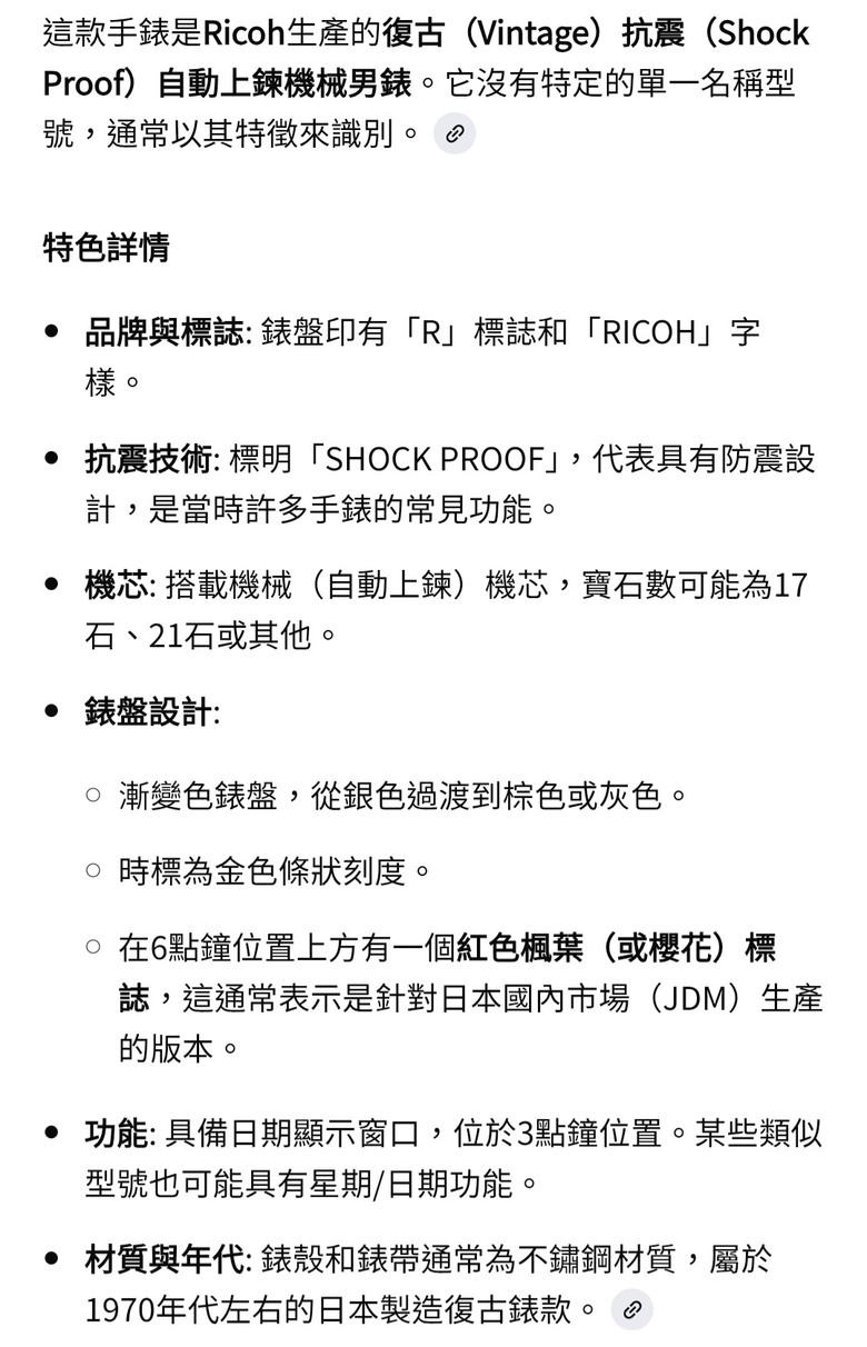 老何boss wrote:RICOH 理光 21石 日期顯示 自動上鍊 機械錶.理光是光學界的長青樹.幾乎生產過各型照相機.計時器即是日稱手錶.跟相機的快門速度有關聯.甚至還有出過V8攝錄放影機.數位也出現高檔機.光學大廠 :PENTAX.如今歸屬理光名下.繼續業務.