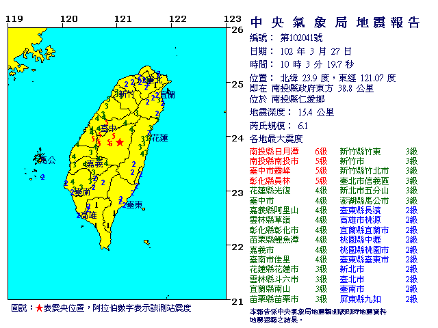 03/27 10:03 南投縣政府東方 38.8 公里 芮氏規模 6.1 (位於南投縣仁愛鄉)