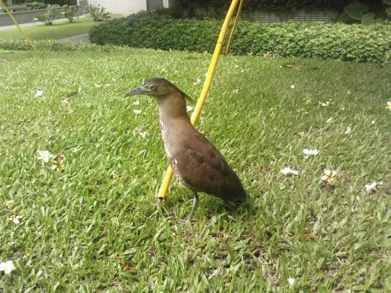 不是夜鷺吧之前在某大的水池旁餵魚的時候看過夜鷺,灰色的羽毛紅色的眼睛,特徵是不怕人,他趁我餵魚靠過來打算撈魚.怕人?拍謝歐!夜鷺不在怕的.他可以離我大約50cm等魚搶我餵的飼料.之後連續五天,這鳥兄天天下午五點來報到,不過他是俗辣鳥,每次都只挑小尾錦鯉,比較生猛的吳郭魚從沒抓成功過,他每次都很俗辣的等錦鯉靠過來,錦鯉不過來光看到一堆生猛的吳郭魚搶飼料,他老兄連下水去抓都不敢.