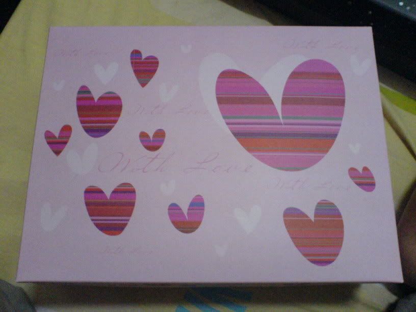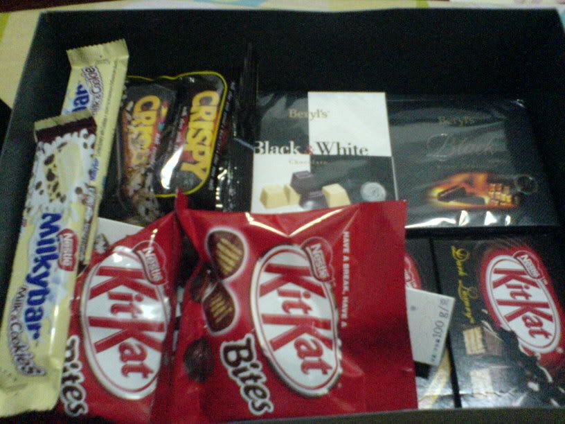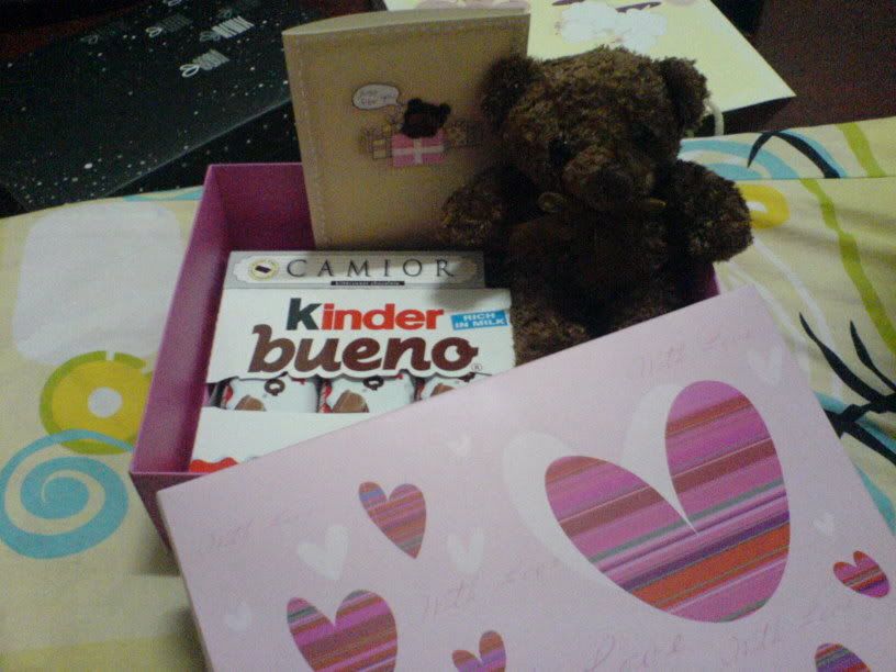 今天是情人节哦。。。各位收或送什么礼物了呢???分享一下吧。。。:D我先来分享我的吧。。。我送了两大盒的各式各样的巧克力给我女朋友咯(外加一只小熊)。。。而我就收到了我女朋友亲自弄的巧克力点心咯。。。看看图吧。。。l两大袋的paper bag..第一包。。。。第二包paper bag里装的礼物盒。。。另外一盒。。。怎么加只手了阿??/ques盒内一览。。有kit kat, black and white 等等等等。。。。小熊一只+ kinder bueno+ 情人节卡一张。。。总共花了约马币(我来自马来西亚)七十块吧。。。还蛮值得的。。:D