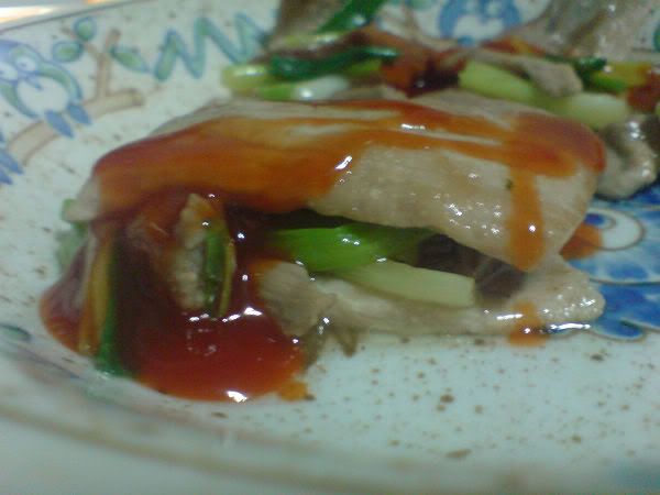 azraeljoker wrote:恩剛剛做的爆香+調味過的蔥段用豬肉片包著配甜辣醬吃~~~
