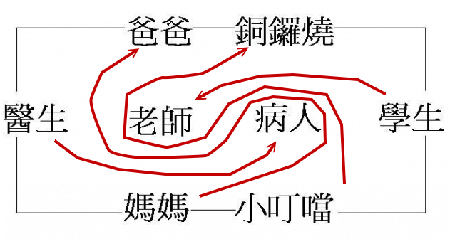 朋友的幼稚園小孩拿回來的回家功課, 這會不會太誇張了, 一堆人都沒有人會...有必要這樣搞小孩嗎???? 不..我想應該是搞家長....醫生愛病人 爸爸愛媽媽 老師愛學生 小叮噹愛銅鑼燒需將這四條愛的連線連起 , 但是線與線之間都不能互相交叉碰到喔, 也不能超出框框喔..真是昏頭了, 不知這裡可有神人可以解答..呵~~還有, 真的不知道該發到那一區, 只有發在這閒聊與趣味區了...