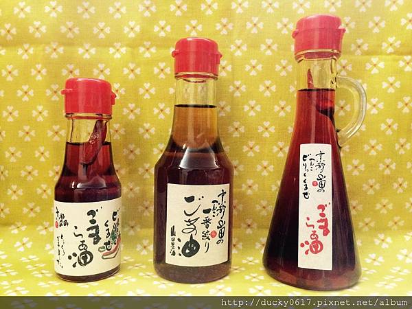 最右邊和最左邊這二瓶就是日本山田製油,以手工研製的胡麻辣油,中間的是胡麻油(芝麻油)。