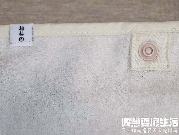 在浴巾下方的小扣子,可以扣在媽媽的脖子後方,整件招福小飛浴巾就會完整攤開。