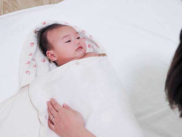 我在月中學到的包巾技巧,把寶寶的左右手放在身體兩側,將右邊浴巾拉緊壓到寶寶身體後方,寶寶會有在媽媽子宮裡時的安全感。