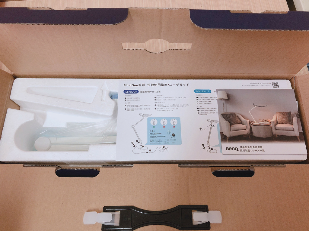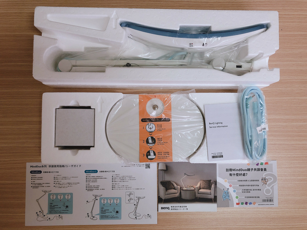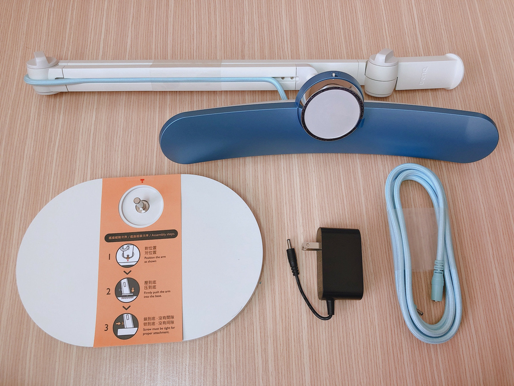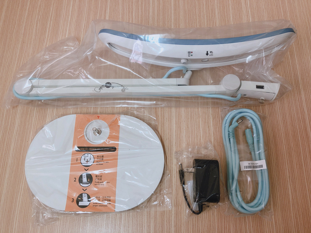 箱子裡全部的內容物如下,上層是檯燈的燈臂與燈本身,下層則有變壓器、檯燈底座、充電線。