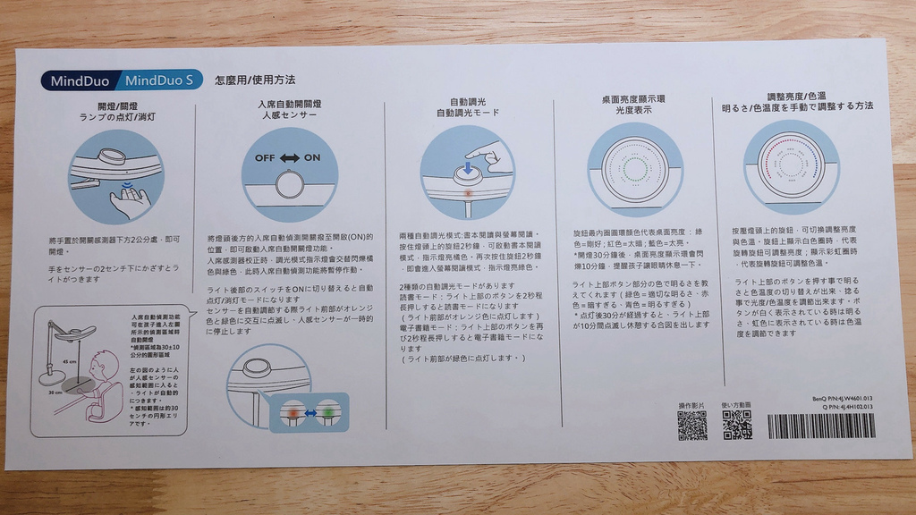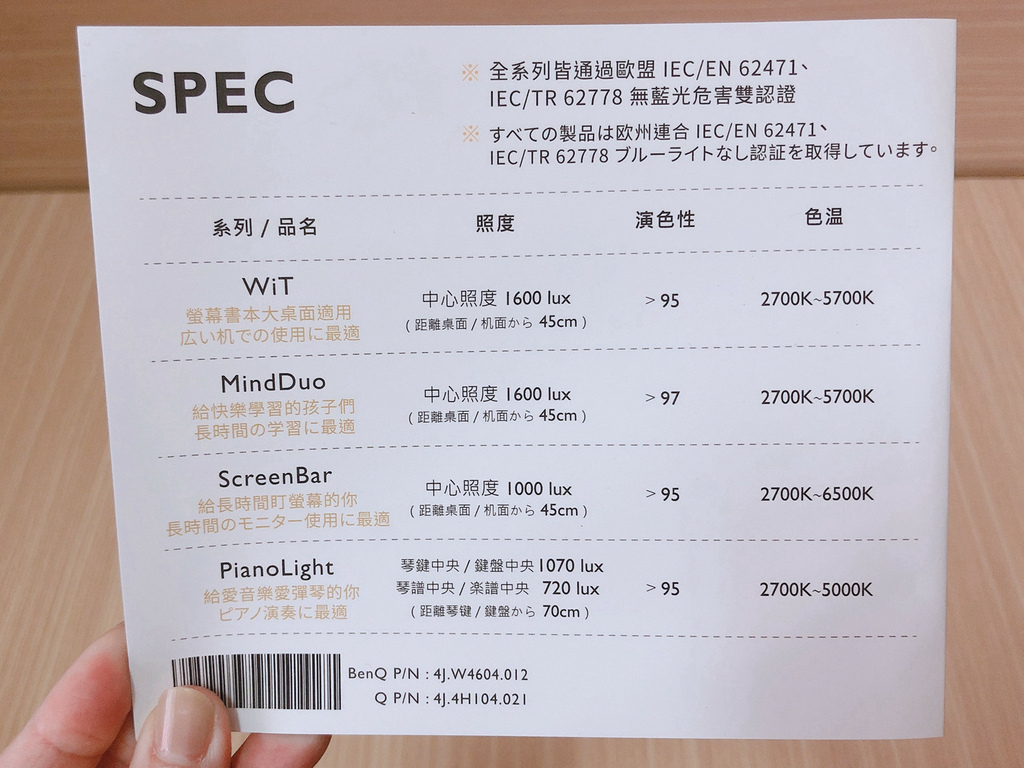 BenQ系列的燈品,全系列都有通過歐盟 IEC/EN 62471、IEC/TR 62778 無藍光危害雙認證。今天開箱的產品是MindDuo,中心照度是1600 lux,演色性>97,色溫2700K~5700K。關於演色性的說明可看這篇文章,CIE(國際照明委員會)提到演色性>90,適用於顏色檢查、色彩校正、臨床檢查、畫廊、美術館,越接近太陽光下所看到的物體的真實樣子就是演色性好。