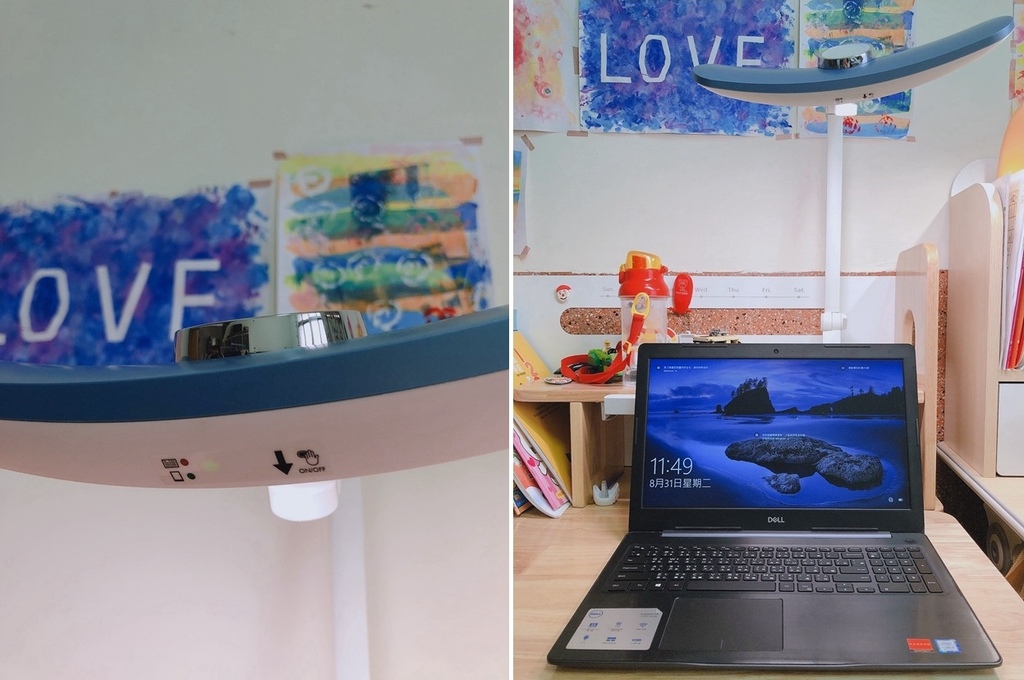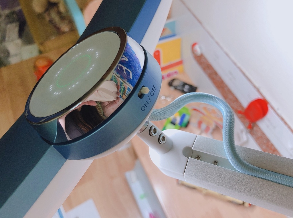 按一下旋轉盤,圈圈會變成彩色的狀態,即可調整色溫。往左邊轉是溫暖的黃光,往右邊轉則是適合寫字的白光。通常在書桌使用,我會建議調整為白光,會更有精神,注意力也能更集中些。黃光比較適合親子共讀時,閱讀故事書使用~