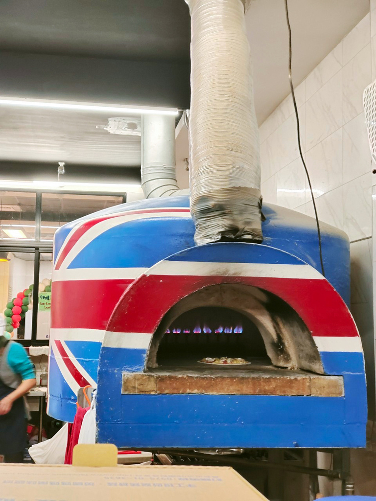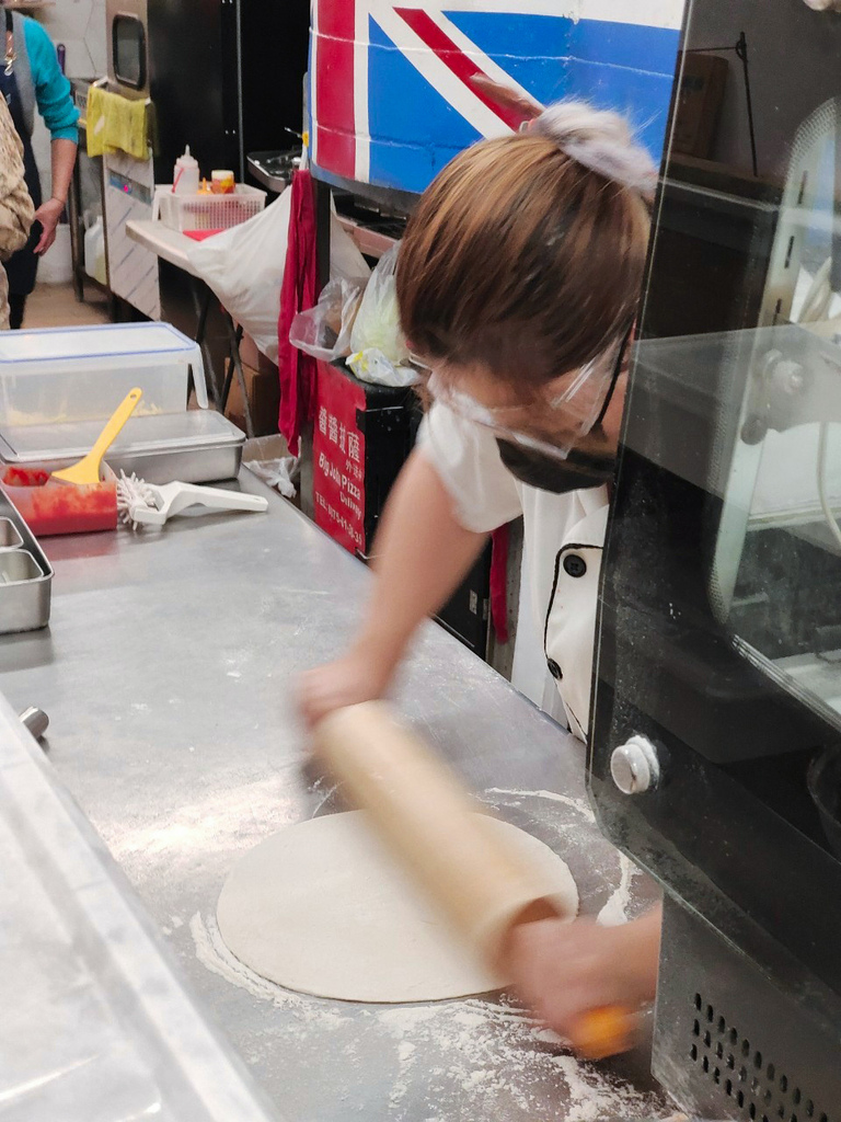 ▼師傅正在桿披薩餅皮,鋪好料,轉身送進窯爐,不一會兒烤色漂亮的窯烤披薩就會出爐~