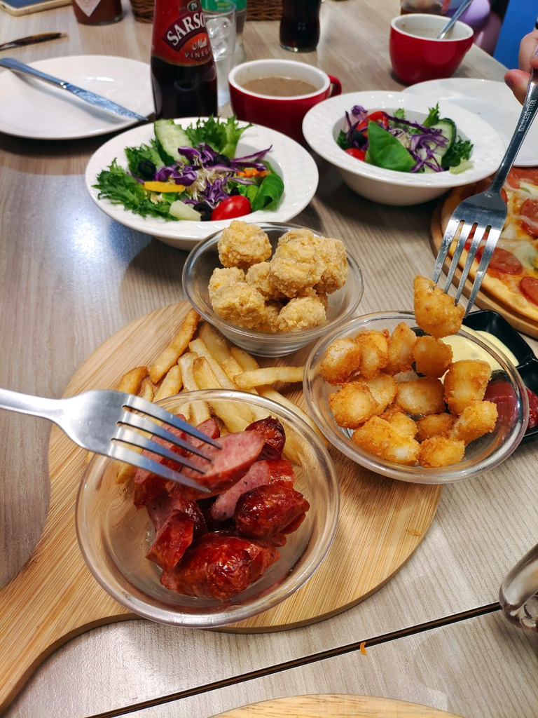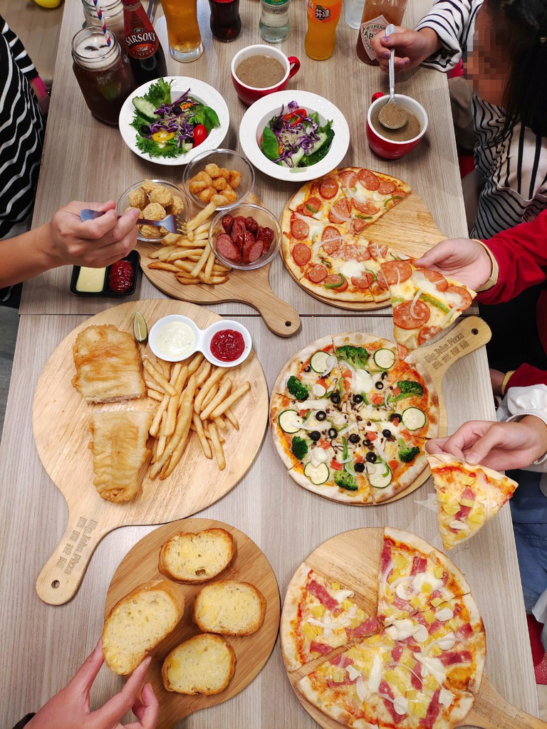 小朋友一人一披薩,點自己喜歡的口味。再點個必吃的英式炸魚薯條、炸物拼盤、套餐和飲料。
