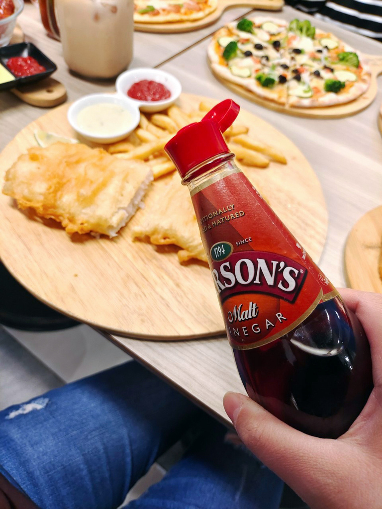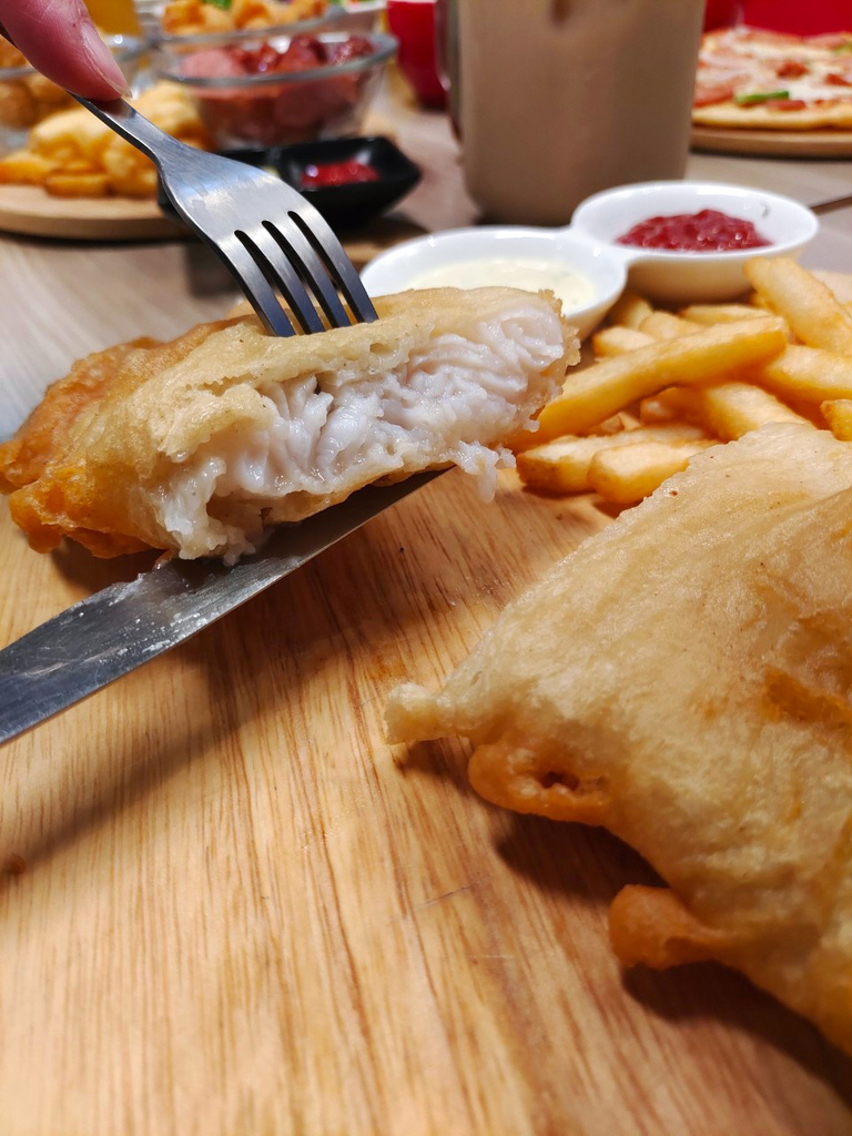 炸魚薯條啤酒麵衣吃起來很爽口,帶有淡淡小麥香,冷掉也不會反油!搭配塔塔醬或番茄醬,或是店家特地從英國帶回來的麥芽醋一起大口咬下,又嫩又脆很討大家歡心,我兒子還說今天這是他心中第一名!