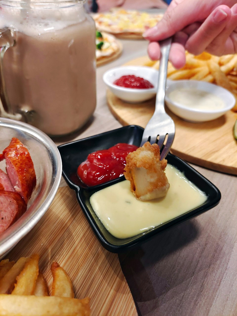 ▼趴踢就是炸物隨意吃!醬醬披薩用的炸物,不管是香腸、雞米花、魷魚含肉量都非常高,薯條也很酥脆,吃起來特別滿足,搭配甜甜的蜂蜜芥末醬也很美味。
