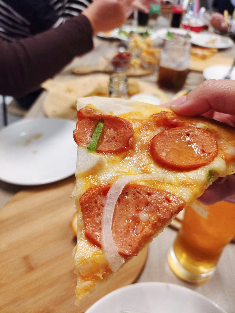 ▼餅皮烤到表面焦香,外酥內Q,煙燻香腸鹹香與起司的濃郁交織,再加上洋蔥的甜味,層次分明,香腸吃起來肉量很高、煙燻味不會很重,一致獲得大小朋友的喜愛!
