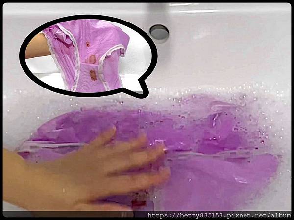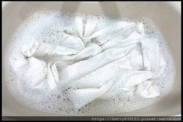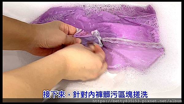 浸泡15分鐘後,再以手針對內褲髒污區塊局部搓洗。
