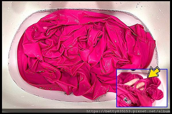 「粉色外套」連帽遮臉防曬外套,箭頭所指之處極為「遮陽口罩」(左右各兩個固定圈可套在耳朵上頭),細節如此多,萬一用洗衣機清洗恐怕會拉扯到,用洗衣袋套入洗滌嗎?又怕清洗不夠徹底啦!那不如乾脆手洗吧!