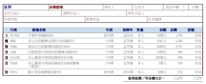 1.富邦也可考慮用XLF好享福10萬20年期主約出單,內容跟XWS差不多.2.富邦的HJR附約可以不要,因為有規劃雙實支實付.3.富邦的MADD大人的只是為了要NMR,用最低額度30萬出單就可以,其它的額度請找產險意外險.tuneimage wrote:先謝謝版主,我之前...(恕刪)