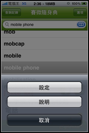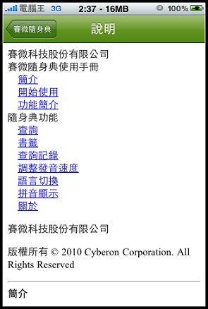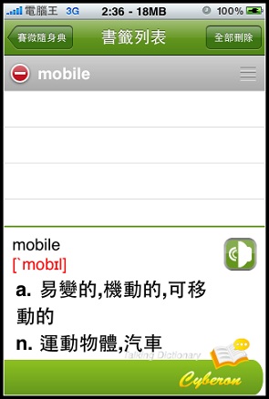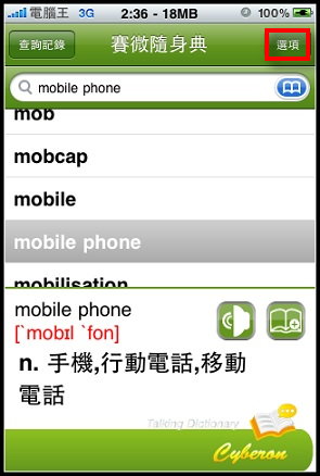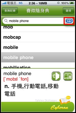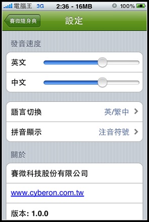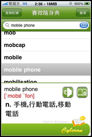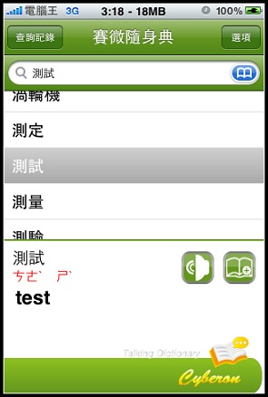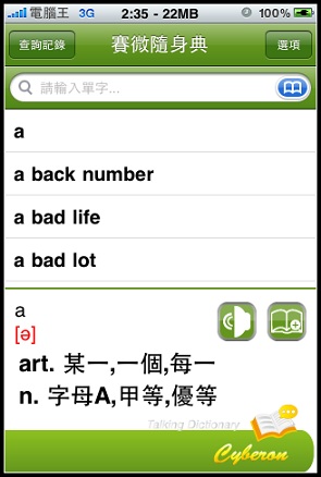 前幾天在下載VoiceGO!的時候查詢Cyberon看到了還有一套新軟體就是賽微隨身典,點進去看他有支援發音功能,稍微查詢了一下另一套Dr. eye要價9.9鎂,而且我印象中好像沒有發音功能,另外一套劍橋英漢字典竟然要24.99鎂!真是嚇死人,想想我常常遇到不會念的英文字(小弟自認讀英文沒困難,但是寫卻卡在文法跟說卡在不懂拼音規則,大家會這樣嗎?)既然現在只賣0.99鎂就趕快敗回來用了: