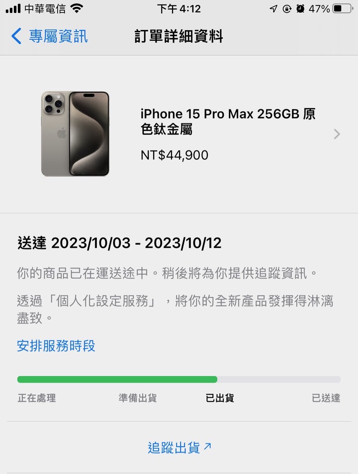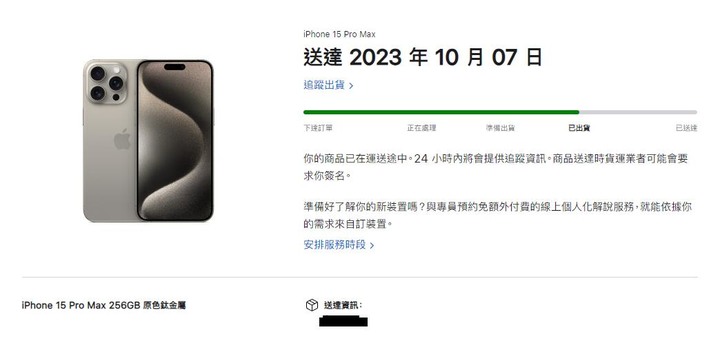 各位同樣10/4號扣款的pro max 鈦原色256有望了剛剛16:50我開順豐app顯示已有apple貨件發出時間16:17正在轉運雖然官網還是顯示準備出貨但是明天能收到的機率至少有了各位可以下載順豐看看用手機號碼登入可以查詢屬於該手機號碼訂單的貨件