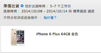唉..真不知道APPLE怎樣的出貨標準我總共訂了2金1銀的PLUS 64G結果目前1金+1銀 顯示準備出貨剩下1今還在處理中....囧這幾支的出貨日還都是10/8-10/14真的搞不懂你阿....APPLE