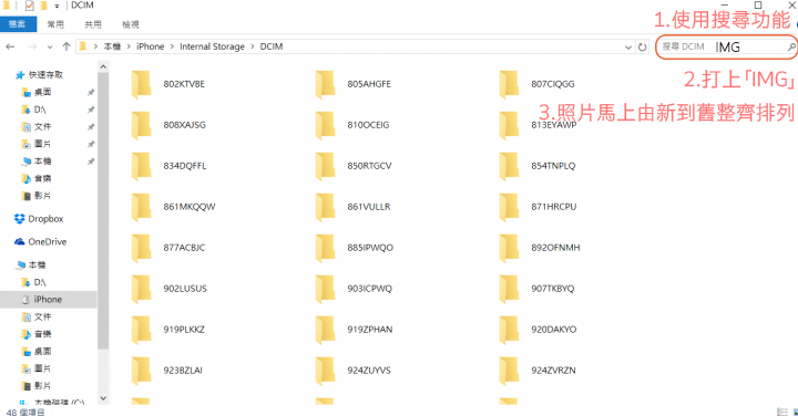 說真的不是每台電腦都有iTunes還是 iTools提供一個小撇步如果是Windows進入到iPhone的DCIM資料夾我會用右上角的「搜尋」功能iPhone的照片命名都是 「IMG_XXXX」你只要在搜尋裡打上 「IMG」所有的照片馬上會照拍攝日期順序從最新排到最舊這是小弟個人淺見~