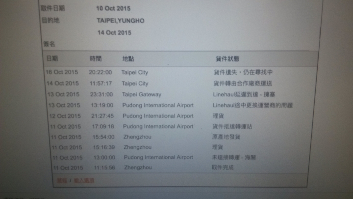 Johnson小賢 wrote:請問有大大也是同天...(恕刪) 卡住就是從國際轉運艙上飛機飛桃園了。這段不會有更新。一直到台北出倉上黑貓才會有更新。黑貓可以詢問進度,不過他們這部分服務做得不太好。個人經驗。