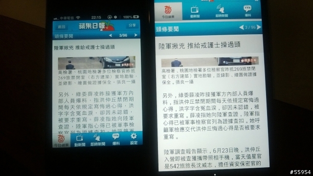 拍謝,拍的時候,主要是想讓相同的文字內容平行,比較好看出字體差異,所以沒注意到被邊緣被截掉,不過兩機絕對沒有調整過字體、或縮放畫面喔。周遭兩台都有的朋友,也可以開來PK看看。phalh wrote:為什麼第一張圖裡,系...(恕刪)