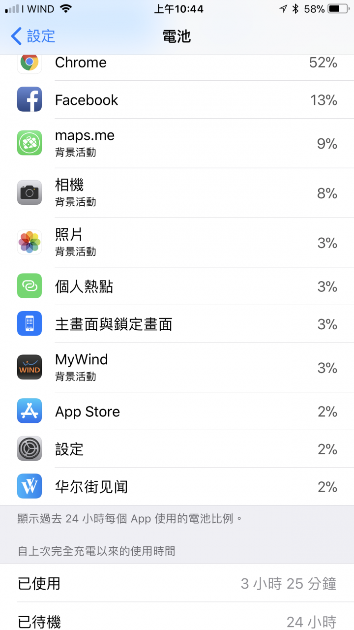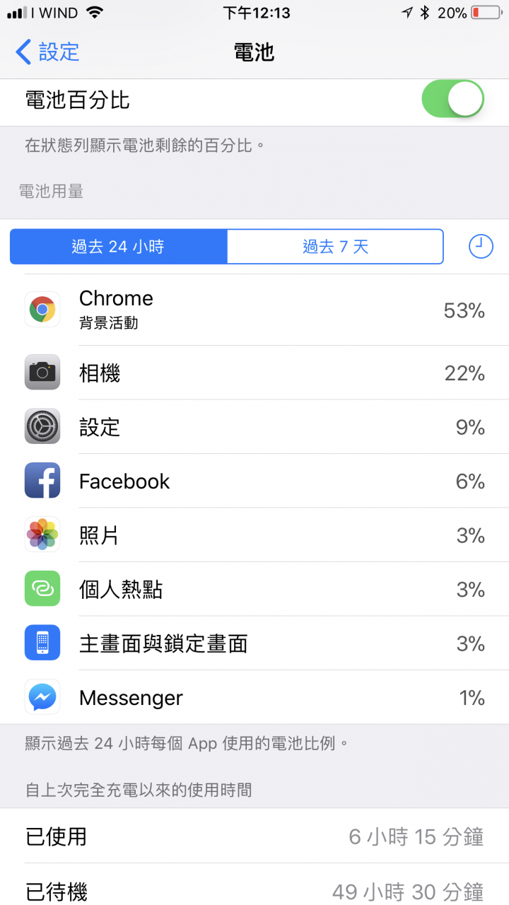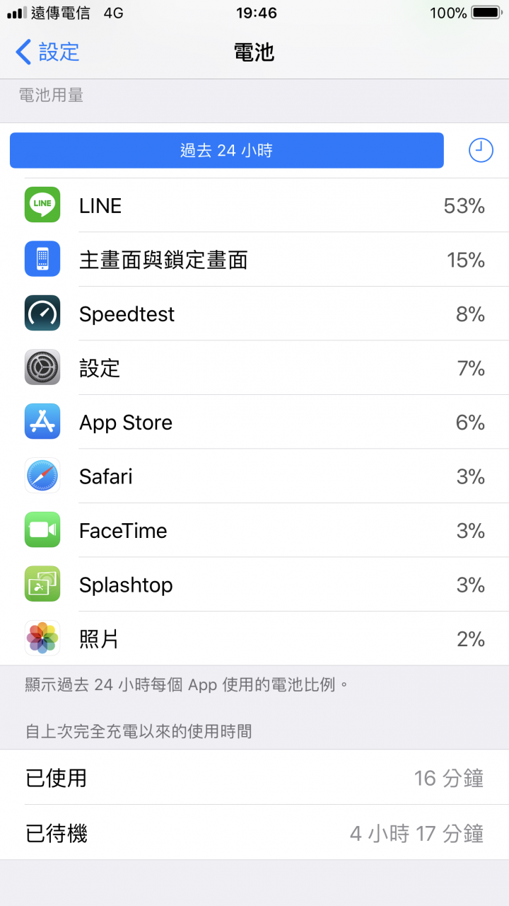 有問題的朋友,請貼出你的耗電狀況會比較容易判斷我的今早100%出門旅遊。其中開熱點分享,maps.me 導航,chrome,照像。晚上到家,還有近80%7+, 11.0.2iOS 11熱點分享給另一台 iOS,這版功能太完美了,我熱點分享整天開著,跟本沒去管它,太完美了。
