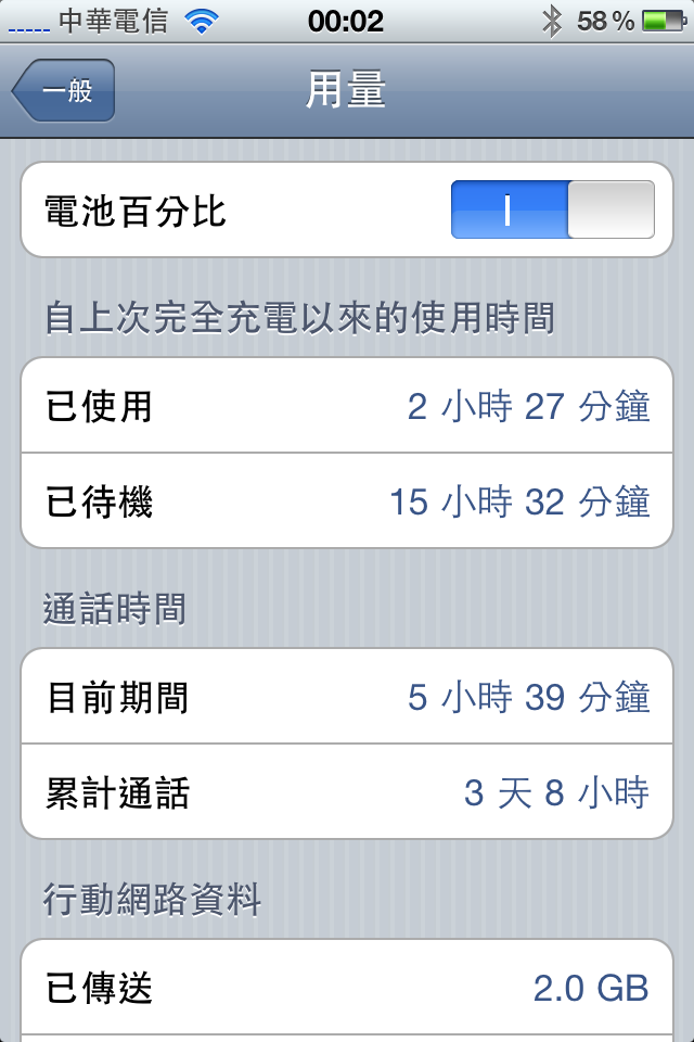 請問各位大大~因為我入手IPHONE4才一個禮拜,所以還感覺不出4.2.1的耗電量跟4.3的耗電量差異今天一早拔掉充電器使用時間3小時17分鐘(瀏覽網頁 下載APP 玩GAME)待機時間15小時22分鐘目前電量還有30%請問這樣算耗電嗎?(只開3G以及定位)
