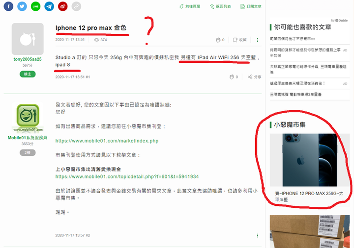 tony2005sa25 wrote:你眼睛有問題嗎?那支藍色的不是我這支好嗎? 別緊張、別激動,請問我圖片裡面,紅色圈起來的小惡魔市集販售廣告那台藍色max,我有說是你的???我只是點進去你被管理員封鎖的那篇Iphone 12 pro max 金色,剛好看到網頁旁邊有01市集販售max的廣告,就把他圈起來,想說是不是二手max太競爭了,還要讓你特地發一篇文章賣Max,還管理員被唯讀 因為你當初自信滿滿的說一堆人私訊要買,現在居然還特地發文我重申一次,Max絕對是今年機皇,很棒的手機,但今年四款12系列手機各有族群,手機不尷尬,崩潰的使用者才尷尬。而且我Pro用得很滿意,Max這麼大台對我個人來說才是今年的第三選擇,你喜歡你的Max替你高興
