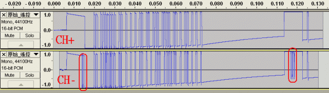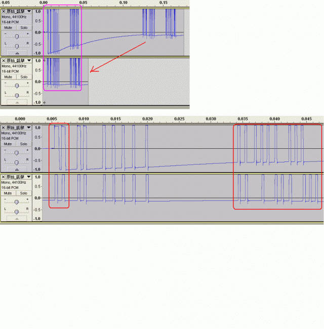 upmost 所提供的凱擘IR檔已經找到控制倍數及頻率了, 我比較用 audacity 直接錄製按鍵訊號有一些差別, 為什麼會不同呢? 是不是它的訊號比較特殊呢? 還是接收器的問題? 麻煩幫我查一下, 謝謝!!附檔簡介:程式各加上了 csv 檔輸出以便後續計算.凱擘學習檔分析\凱擘成功控制記錄.txt這個檔為記錄試過可控制的記錄, 並註明各頻率參數, 還有各按鍵對應功能名稱.凱擘學習檔分析\02 - ok.csv凱擘學習檔分析\02 - ok.raw凱擘學習檔分析\02 - ok.wav這三個檔為可控制的往返按鍵的資料.製作wav\製作wav.wav製作wav\製作wav.wav.csv製作wav\製作wav.wav.raw這三個檔為直接用 audacity 錄製後再用製作wav程式輸出.製作wav\原始_凱擘往返_1.wav這個為直接用 audacity 錄製後所得.音源紅外線工具