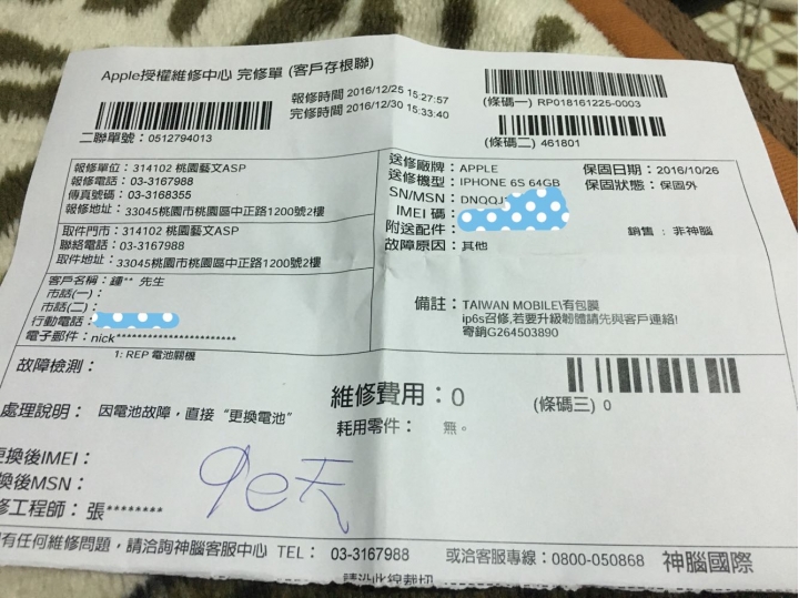 因個人怕換了電池有問題時官方把韌體版本升級(為了等ios10.1.1 版本JB工具釋出),所以送檢測時再三要求門市小姐更換電池時別升級韌體,並在維修單註明要升級時請先通知我,好讓我決定是否要為了更換電池而放棄現有韌體版本。
