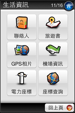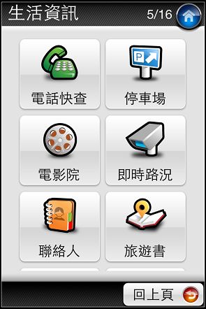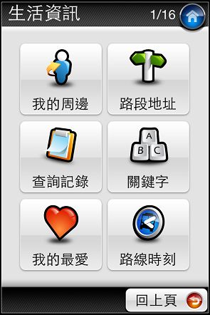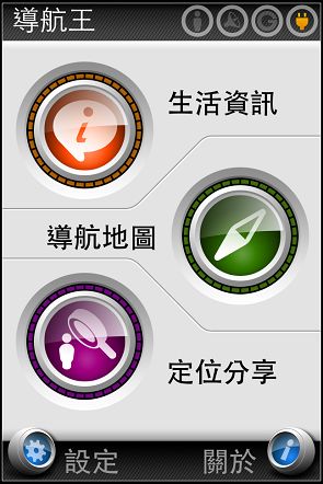 主畫面選單一樣以生活資訊、導航地圖、定位設定等三大項組成:
