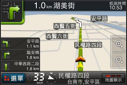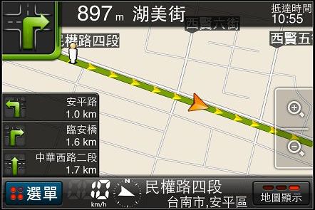 最後看看導航軟體最重要的靈魂---導航進行時的畫面與介面,有日夜的分別轉彎方向提示與實景圖一樣不缺但是沒有跟PAPAGO一樣的3D模型提示比較可惜(這部份我個人覺得可有可無,當然是有的話是有加分的效果):