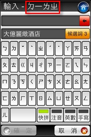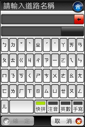 因為導航王有內建自己的快拼輸入法,所以我們只要輸入路名每個字的第一個注音就可以找到,有相同讀音的話再從「候選詞」下去選擇:
