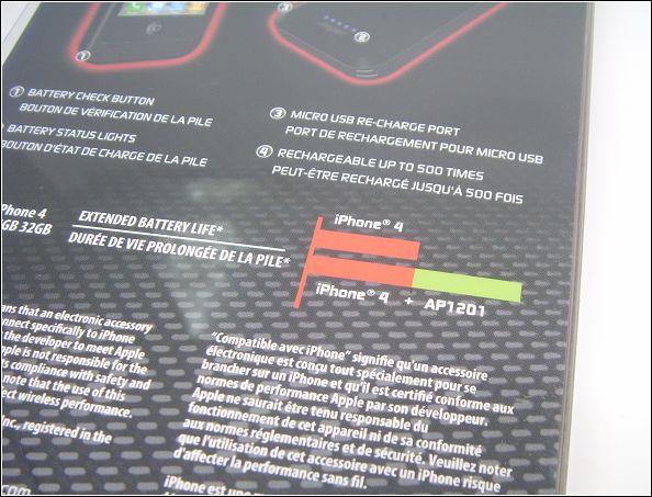 背面的說明顯示可增加一倍的續航力,Energizer AP1201內建電池容量為1200mAh,跟iPhone4內建的1420mAh相比容量還是比較小的: