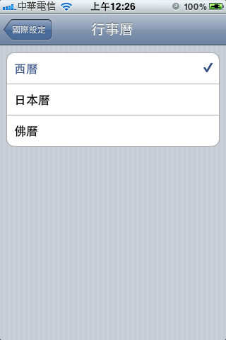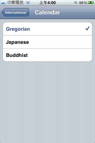 iOS 4.0是今年6月21日發佈,由擷取畫面明顯可見中華民國曆(Republic of China)的選項(設定 > 一般 > 國際設定 > 行事曆)。