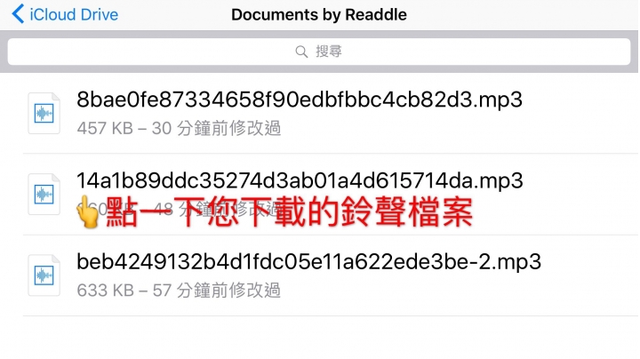 21. 接著會跳回音訊檔案頁面,此時選擇您下載的鈴聲檔案按著不放