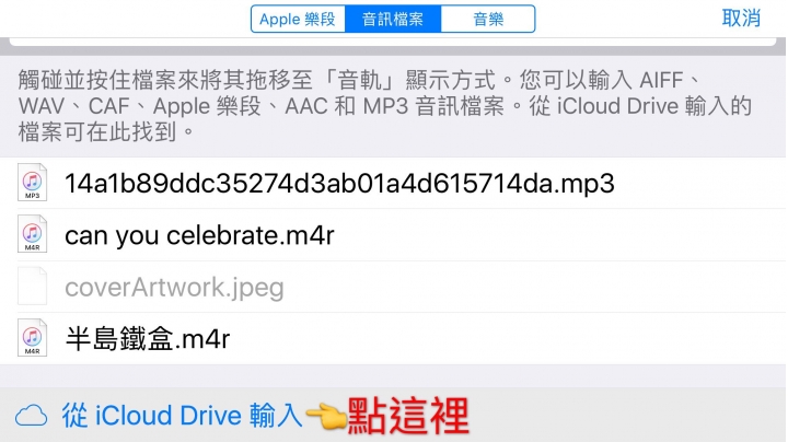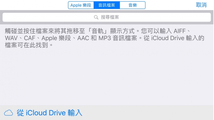 19. 選擇「音訊檔案」,接著點正下方的「從 iCloud Drive 輸入」