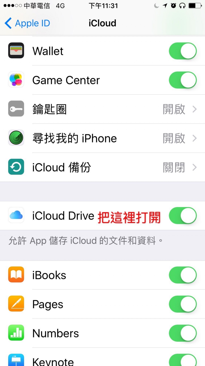 4. 然後將 iCloud Drive 選項打開後就可以關閉手機「設定」