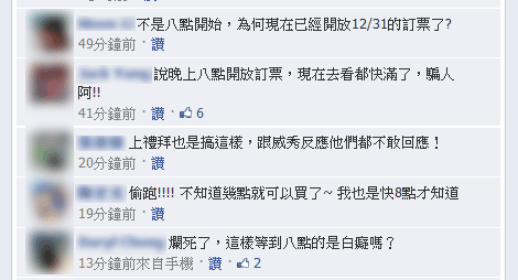 喜愛看電影的我,總是習慣去威秀影城看,這次跨年免不然的也是規劃看完電影直接看煙火!威秀的臉書粉絲團公告說12/30 20:00開放訂票很開心的等著20:00的到來。就在期待中,我先登入了網路訂票系統想說八點一到就開始搶票結果看到了.....登入時間則是在晚上7點左右就登入看了....結果又是訂票系統偷跑嗎?那我在等8點再等辛酸的阿附上於粉絲團詢問的時間證明當時已發現此情形