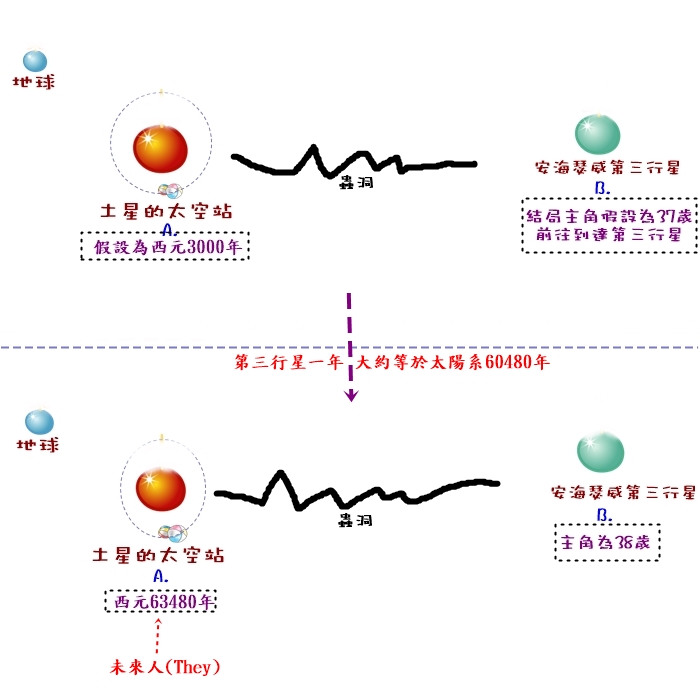 而當我們回頭看那顆1小時等於7年的星球,在那顆行星待一年 大約等於太陽系6萬年!!