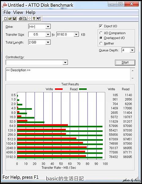 可以看到讀取可以到97MB/S左右的高速 , 而寫入最高也跑到了79.1MB/S , 非常接近標示的80MB/S了..