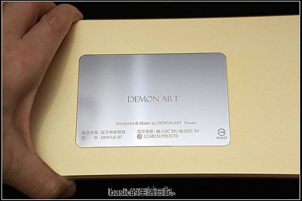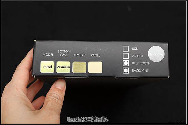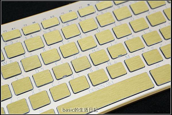 側邊的標籤很清楚的標示 , 這是一支金屬鍵盤 , 顏色是金色 , 鍵帽的材質也有明確的標示