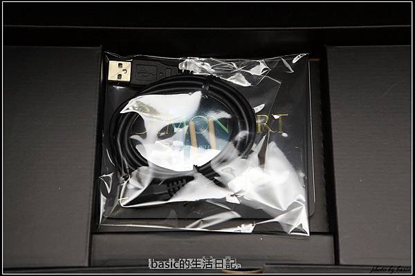 將鍵盤本體拿起來後就可以看到下層有放了一些配件 , 包括了USB線 , 額外的鍵盤腳膠條 , 保固卡及說明書..