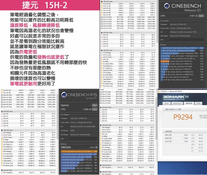 BaoBaoKing worte:雖然說Intel比較...(恕刪) 掛模擬器AMD不錯的是桌機的CPU筆電的CPU真的差太多了真的不要誤導別人比較好其實樓主的使用需求買捷元的15H是最好的選擇CPU有60W的長時間功耗運作能力這是優化之後的15H-2的實測組合圖分享給樓主參考看看3萬已內可以買到I7-9750H+GTX1050/16G/512G NVME的配置無線網路卡是9560AC高階的版本以上資訊分享給大家參考