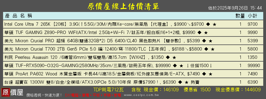 Intel Core Ultra 7 265K PassMark效能分數:58812GeForce RTX 5090 PassMark效能分數:39236https://www.coolpc.com.tw/tmp/1758872644142305.pnghttps://www.coolpc.com.tw/tmp/1758872644142305.htmIntel® Core™ Ultra 處理器讓遊戲更順暢https://www.intel.com.tw/content/www/tw/zh/products/details/processors/core-ultra/play.html