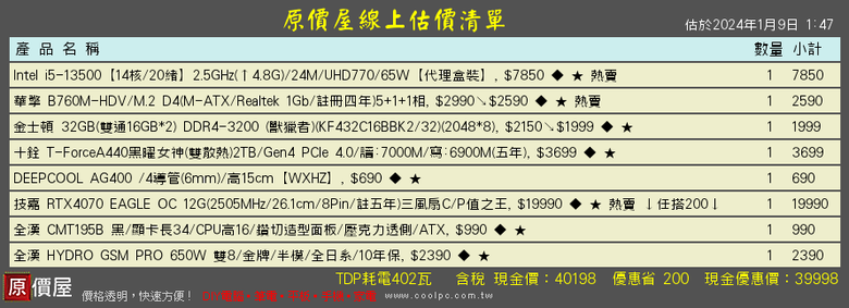 魚與魚肉 wrote:有自己小拉一張,但超...(恕刪) 12 代其實有補貨然後你配那個板子 DDR4, 沒辦法裝 DDR5...那單子配起來應該爆到 45k 去了42k 不含 os, i5-13500, 32g, 4070板卡都選五年保的, 機殼看個人喜好40k 不含 os, i5-13500, 32g, 4070改這樣就 40k 預算內