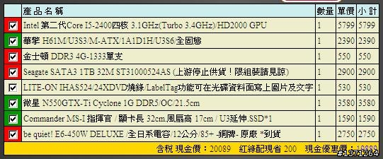 試著用原價屋稍微配了一下,給你參考看看,原價屋的微星GTX465 TwinFrozr II-B已經下架了,幫你估算了另外一塊微星N550GTX-Ti Cyclone 1G DDR5/OC/21.5cm 效能差異不大,價差200左右.連結:http://coolpc.tw/tmp/1320868183281872.htm圖片:參考一下,希望對你有幫助